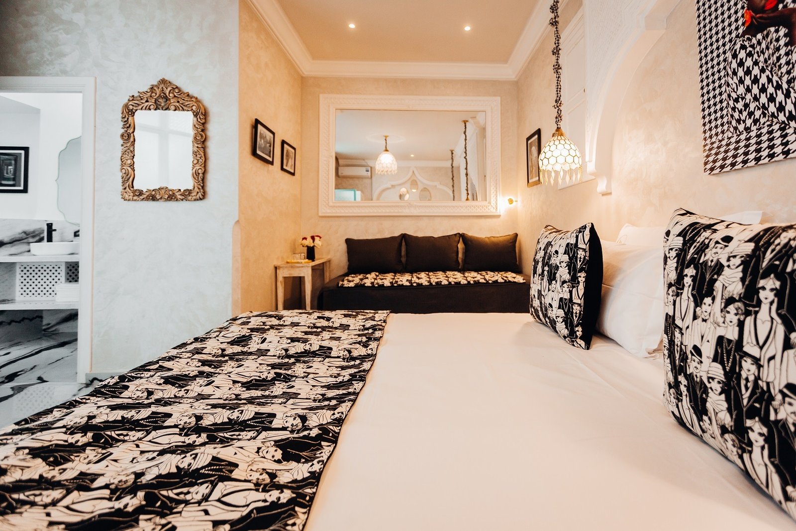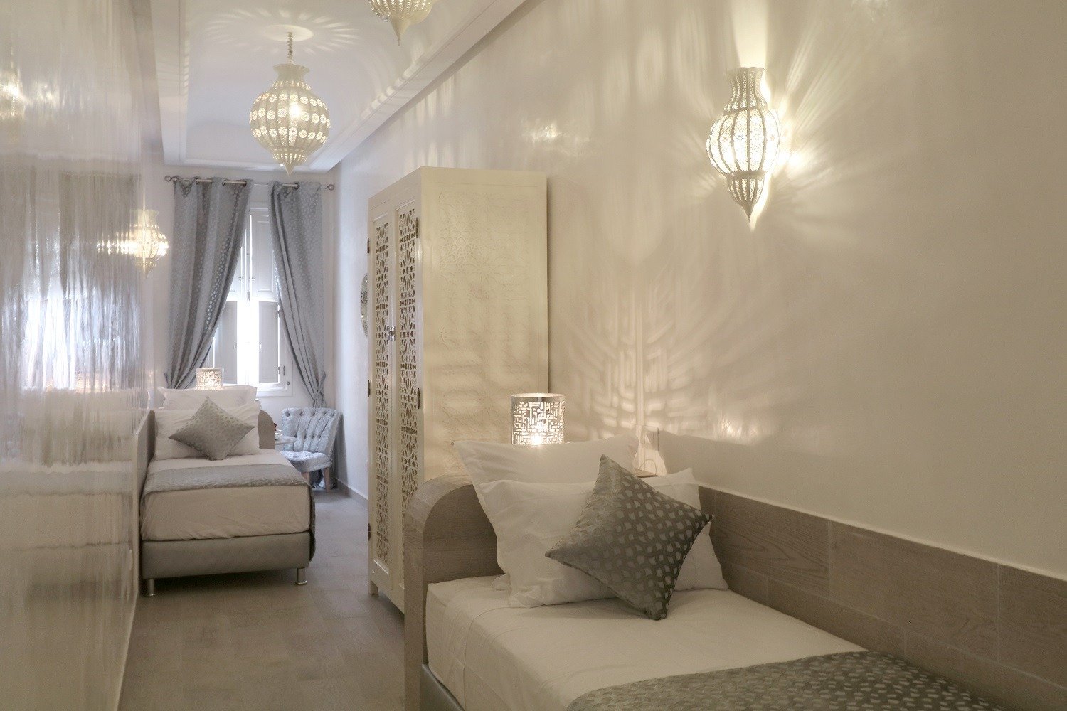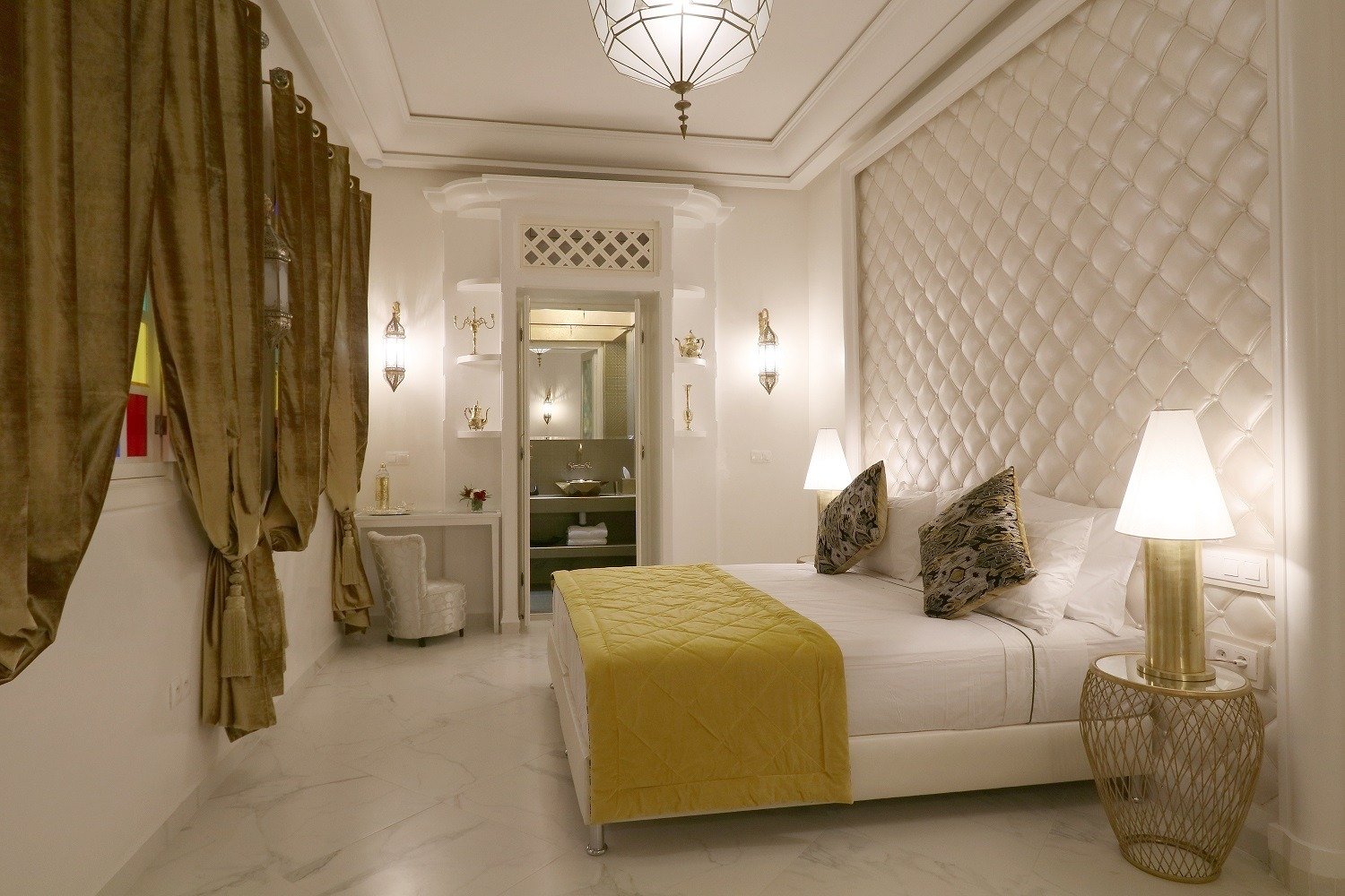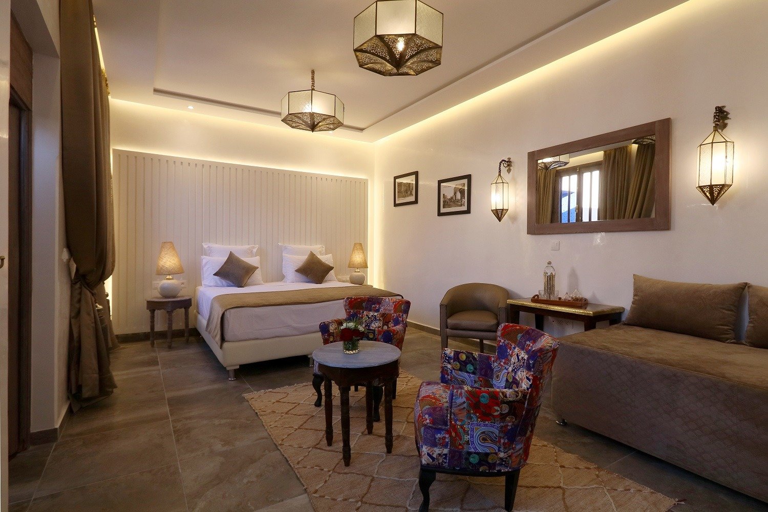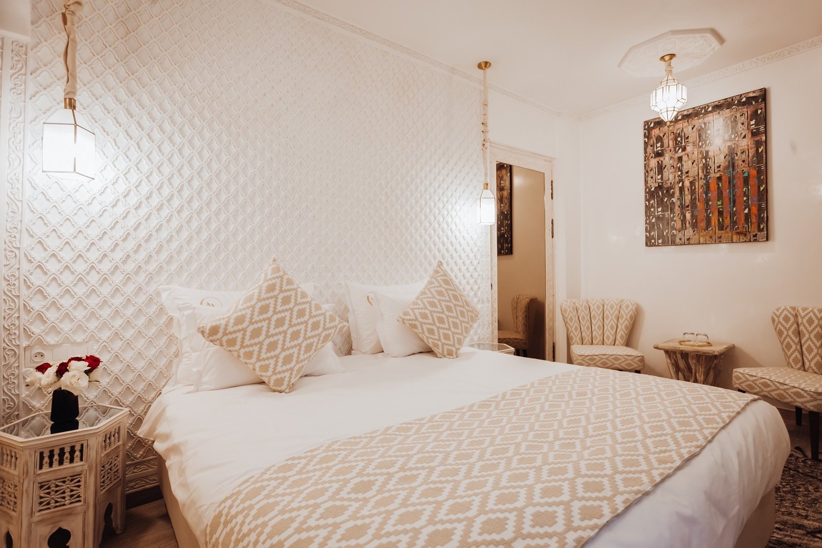 Cozy, luxurious room blending warm comfort, Moroccan touches, and peaceful relaxation.